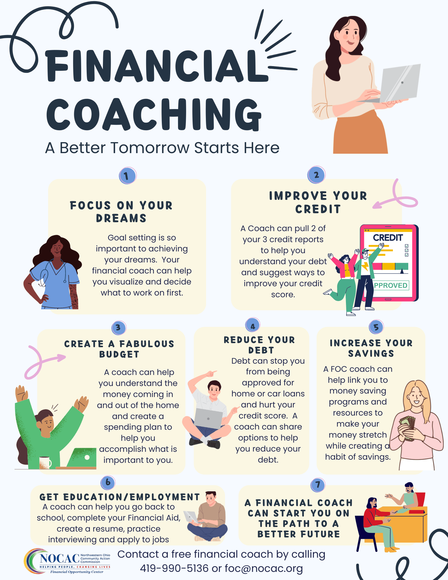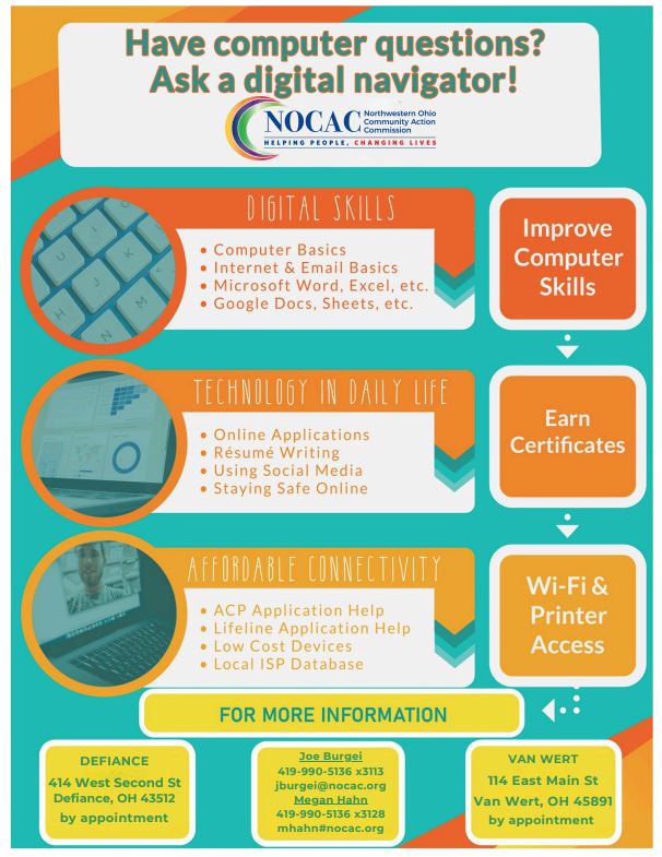 Northwestern Ohio Community Action Commission (NOCAC) is a locally controlled, private, non-profit organization that was incorporated in 1965. NOCAC is a primary source of direct support for over 6,000 low-income households in our six-county jurisdiction. NOCAC is dedicated to planning, developing and coordinating programs and services designed to combat conditions related to poverty in Defiance, Fulton, Henry, Paulding, Van Wert, and Williams counties. NOCAC continues to offer guidance to the consumers of our services, in the attainment of skills, knowledge and motivation that are necessary to become and remain self-sufficient members of the communities in which they live. NOCAC operates a homeless shelter/soup kitchen and facilitates a variety of community programs including Emergency Assistance, Publicly Funded Child Care, Head Start/Early Head Start, Homelessness Prevention, and Weatherization Assistance and Repair as well as the Financial Empowerment Program, now a Financial Opportunity Center (FOC).