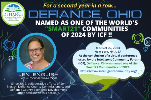 Defiance, Ohio is proud to be on the global stage as one of the Smart21 Communities of 2024. This designation would not be possible without the support and collaborative efforts of the Defiance County Commissioners and Defiance County Economic Development Office. City of Defiance’s MS4 Coordinator Jen English has been working on this since 2019 and deserves much of the credit for this accomplishment for Defiance, Ohio. Thank you, Jen!