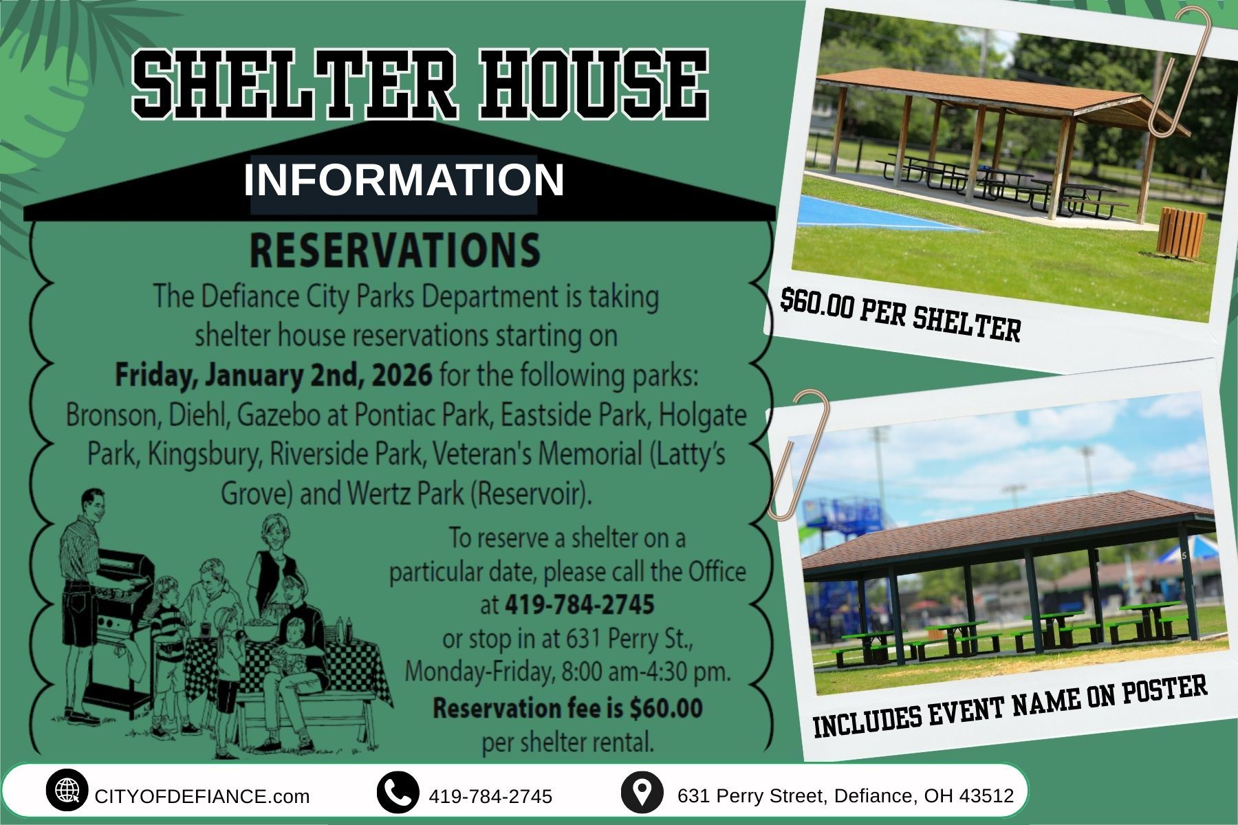 Reservations are $60 per shelter house and include the event name on a poster.